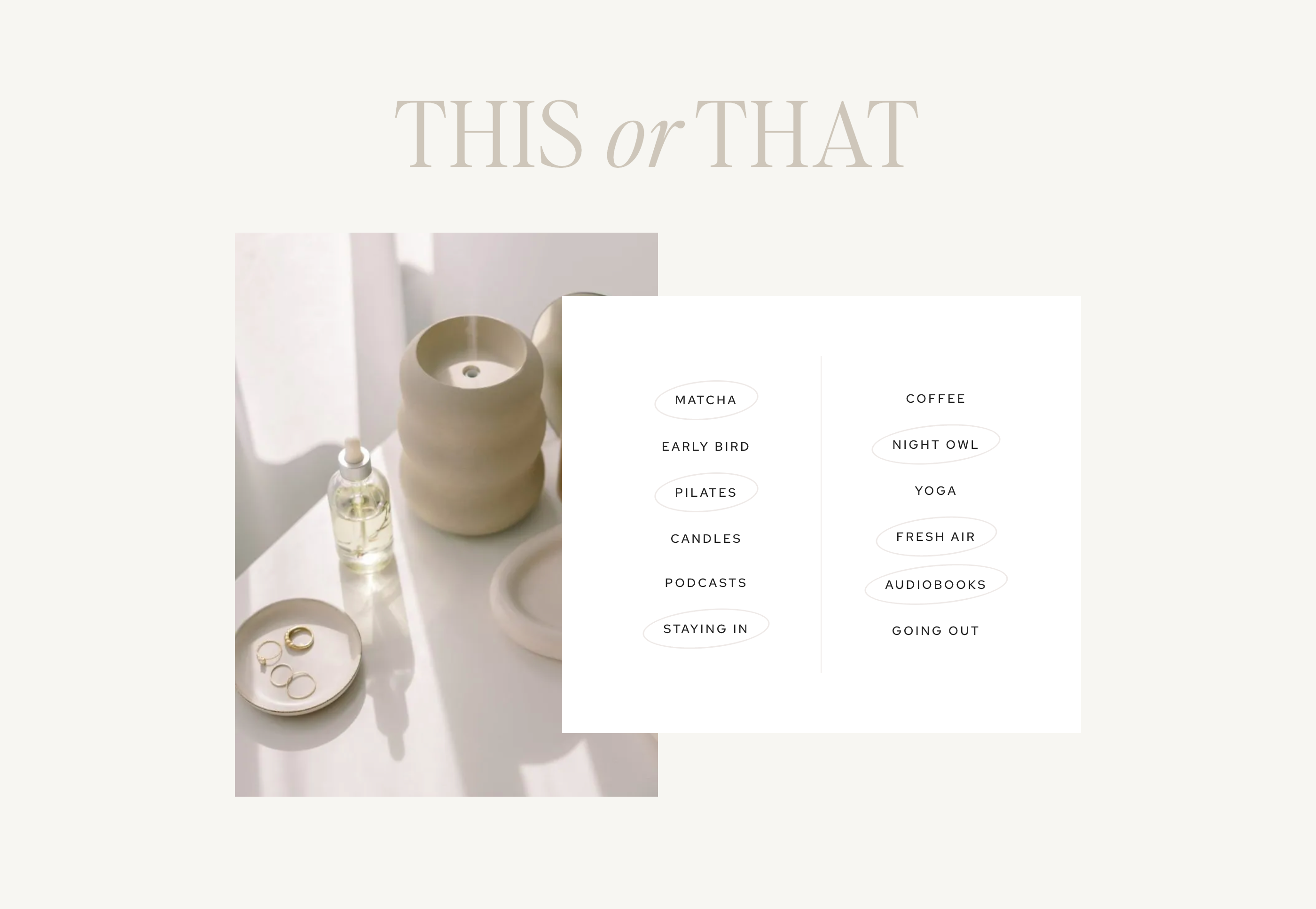 - Dividing line color: Select the left Section block of the This or That box (i.e. the column that starts with "Matcha"). You can use List View to make sure you're selecting the correct Section block. Once selected, go the Section block settings > Style > Border Styles. Change the border color to your preferred color.